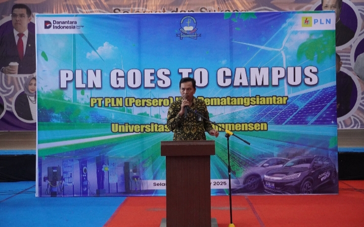 Rektor Universitas HKBP Nommensen Pematangsiantar, Dr. Muktar B. Panjaitan, S.Si., M.Pd., menyampaikan apresiasi atas inisiatif PLN menggelar kegiatan edukatif di lingkungan kampus.
