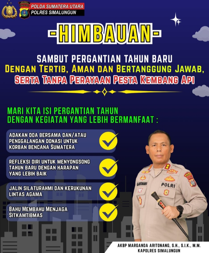 Menjelang malam pergantian Tahun Baru 2026, Polres Simalungun Polda Sumatera Utara menyampaikan imbauan penting kepada seluruh masyarakat agar perayaan tahun baru dilakukan secara tertib, aman, dan bertanggung jawab. Imbauan ini merupakan bagian dari kegiatan profesional Polri dalam menjaga keamanan dan ketertiban masyarakat, sekaligus mengajak warga mengisi momen pergantian tahun dengan kegiatan yang lebih bermakna dan bermanfaat.