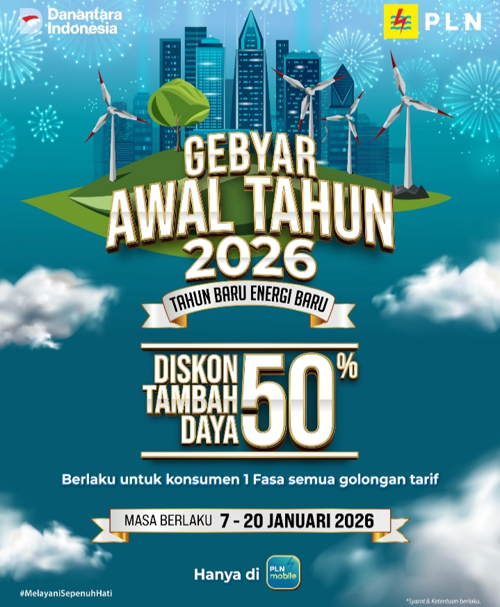 Menyambut Tahun Baru 2026, PT PLN (Persero) menghadirkan program layanan tematik “Gebyar Awal Tahun 2026” dengan memberikan diskon biaya tambah daya listrik hingga 50 persen bagi pelanggan setia.